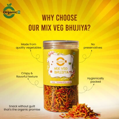 Enjoy a colorful burst of flavors with Organic Basket Mix Veg Bhujia, a crispy ready-to-eat snack made from a blend of real vegetables like potato, beetroot, and carrot. Carefully seasoned with spices and prepared using hygienic processes, this bhujia offers a perfect balance of taste and crunch.