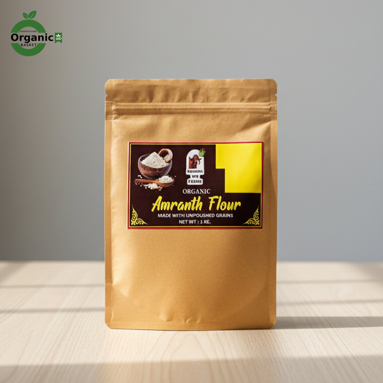 Experience the power of ancient grains with Nandini Gir Farms Organic Amaranth Flour (1kg) – made from premium, unpolished amaranth grains.